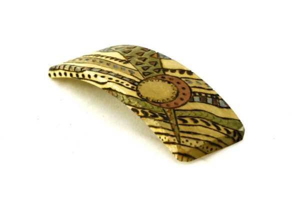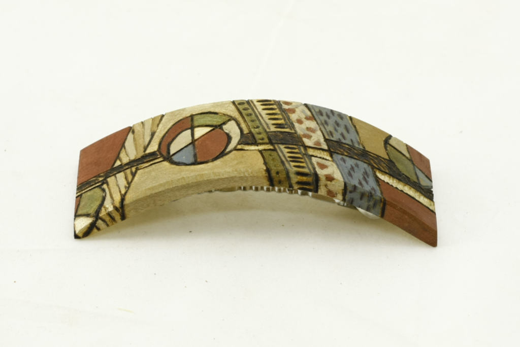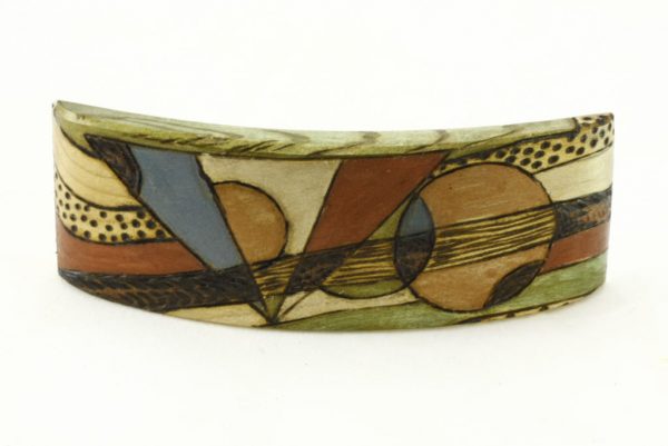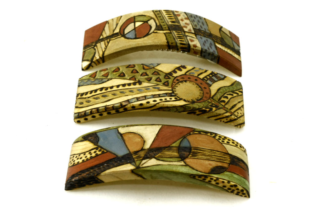 These art deco barrettes feature unique colorful designs on a wooden barrette. The designs are burned into the wood, and then colored. Polyurethane protects the coloring.