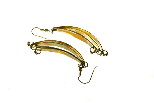 The Brass Dangles w/ Silver Rings Earrings have 4 formed brass arcs side by side with brass rings and golden seed beads on the bottom. Natural patina from the air give many hues of gold to the brass.