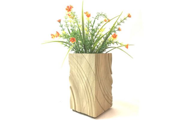 These floating vases are each unique and visually exciting. Made from poplar wood, which has a natural pale green color, they were turned on the lathe and then assembled and arranged into an elongated square. Inside there is a glass sleeve so that you can use either fresh flowers or dried flower arrangements. The bottom is inset, hence the vases appear to float!