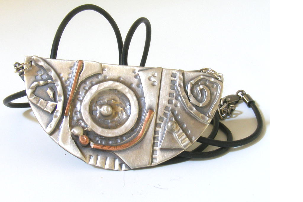 The Reborn 4 Sterling Silver Half Circle Necklace celebrates the theme of being reborn. It was made from hammered sterling silver and copper accents.