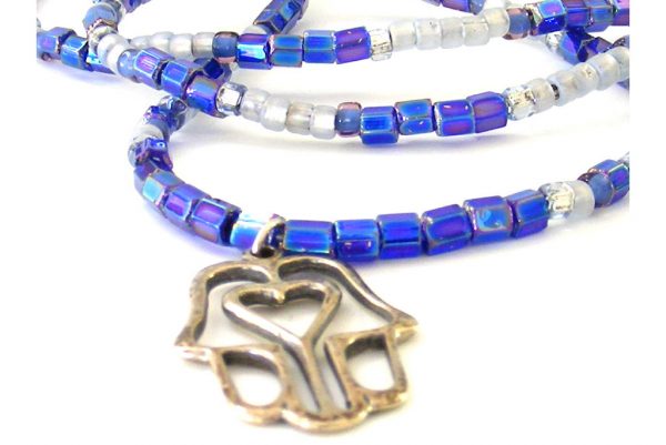 Stylized sterling silver hamsa (hand) on a seed bead strand with variated colors. With sterling silver findings.…Read More