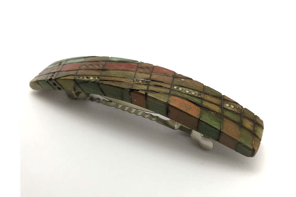 Each one of these art deco barrettes has a unique handmade design that is burned into the wood and then colored. These are thin colorful wooden barrettes, whose designs are protected with multiple coats of polyurethane.